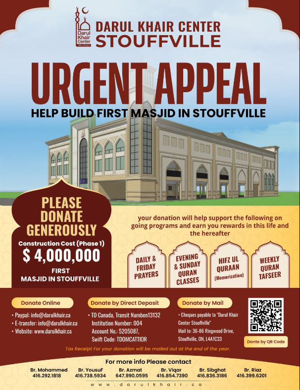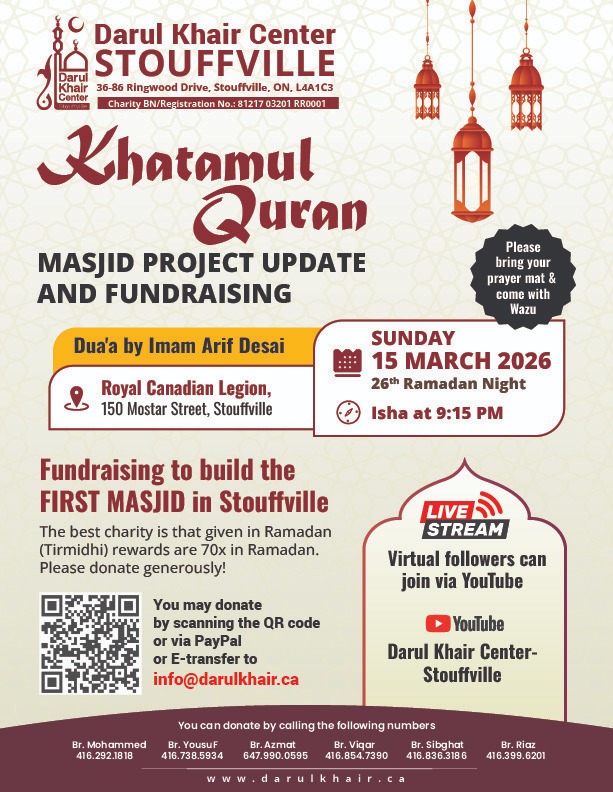 More than just a prayer space, Darul Khair Center is the heart of Muslim life in Stouffville. Join us for daily worship, Islamic education classes, and community-building events designed to nurture the spiritual well-being of our youth, seniors, and families